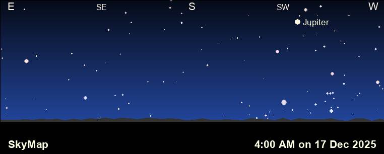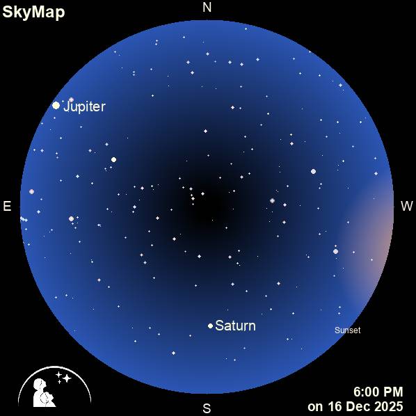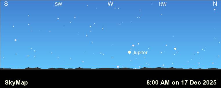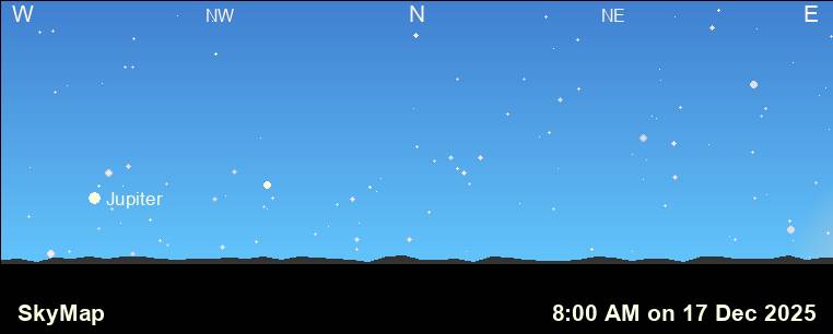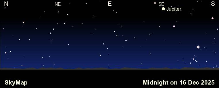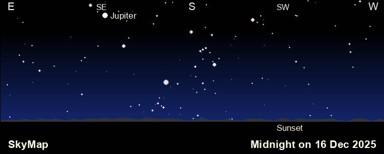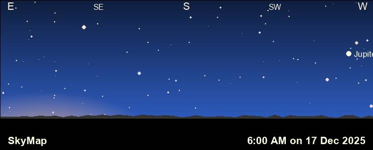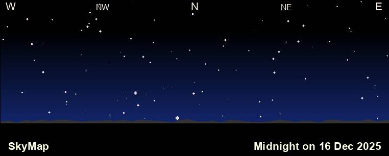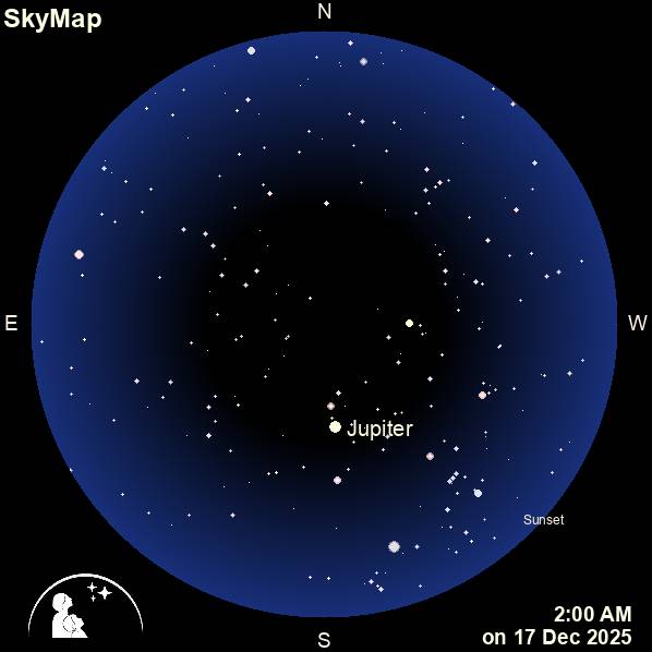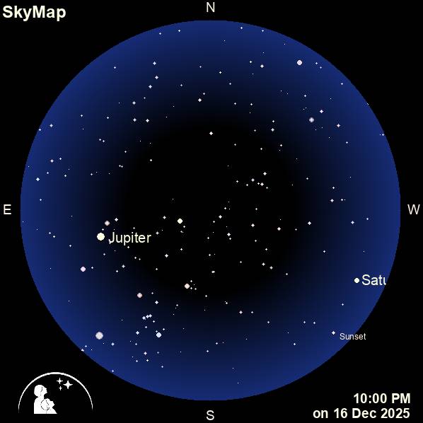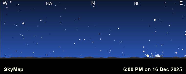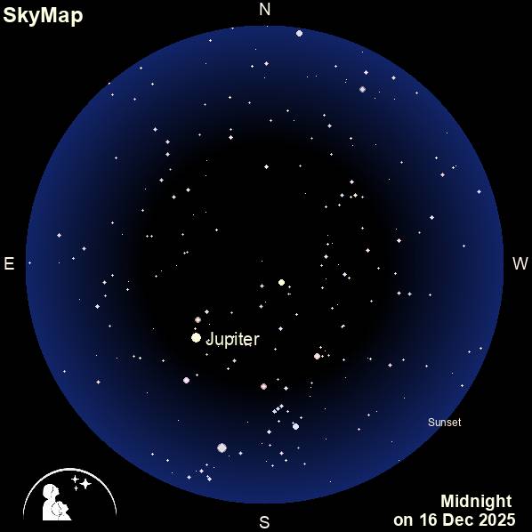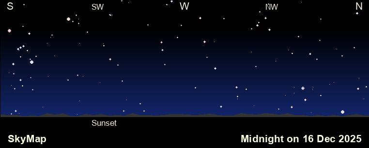Our whole sky maps show the sky over the UK for each 2-hour time frame. This is automatically refreshed each night. The observer's horizon is around the outside of the circle. The centre of the picture is the point in the night sky directly above the observer. The four points of the compass (North, East, South and West) are shown, as well as the position of the sunset.