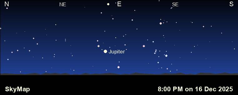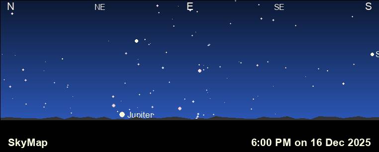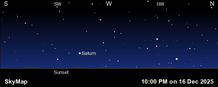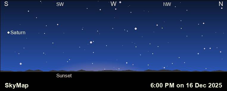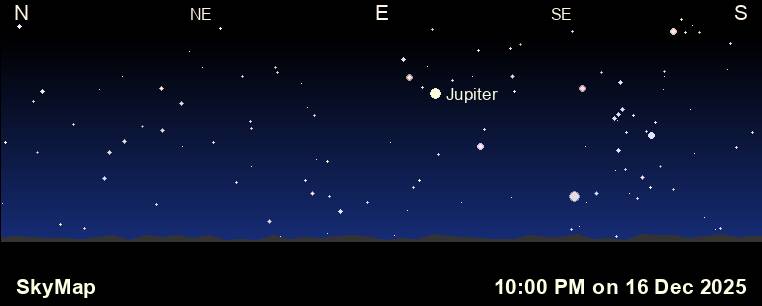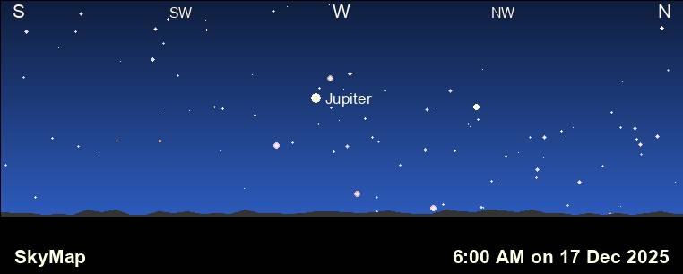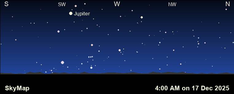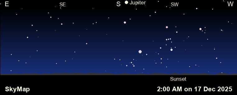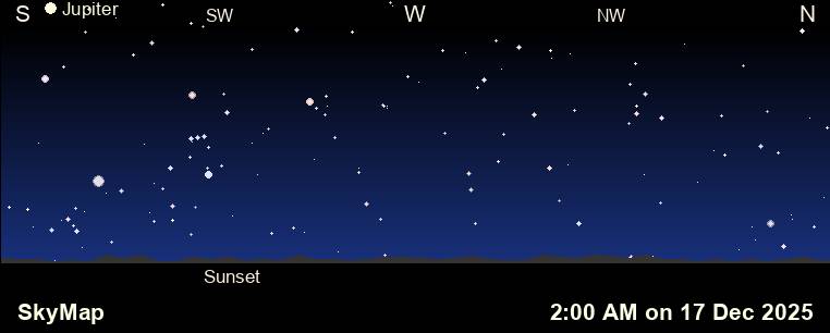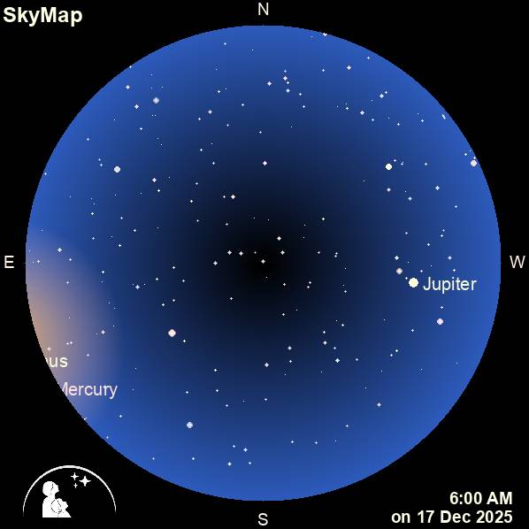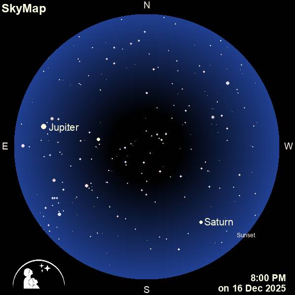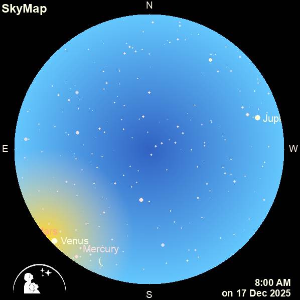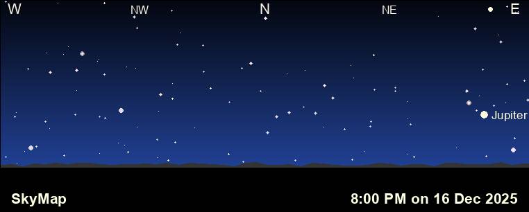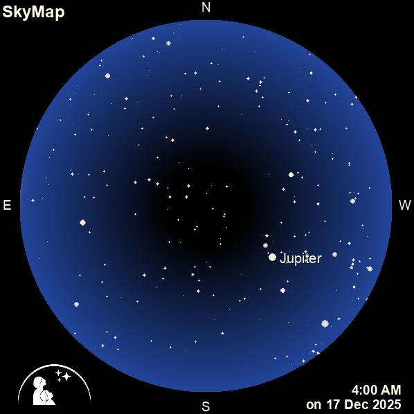 Our whole sky maps show the sky over the UK for each 2-hour time frame. This is automatically refreshed each night. The observer's horizon is around the outside of the circle. The centre of the picture is the point in the night sky directly above the observer. The four points of the compass (North, East, South and West) are shown, as well as the position of the sunset.